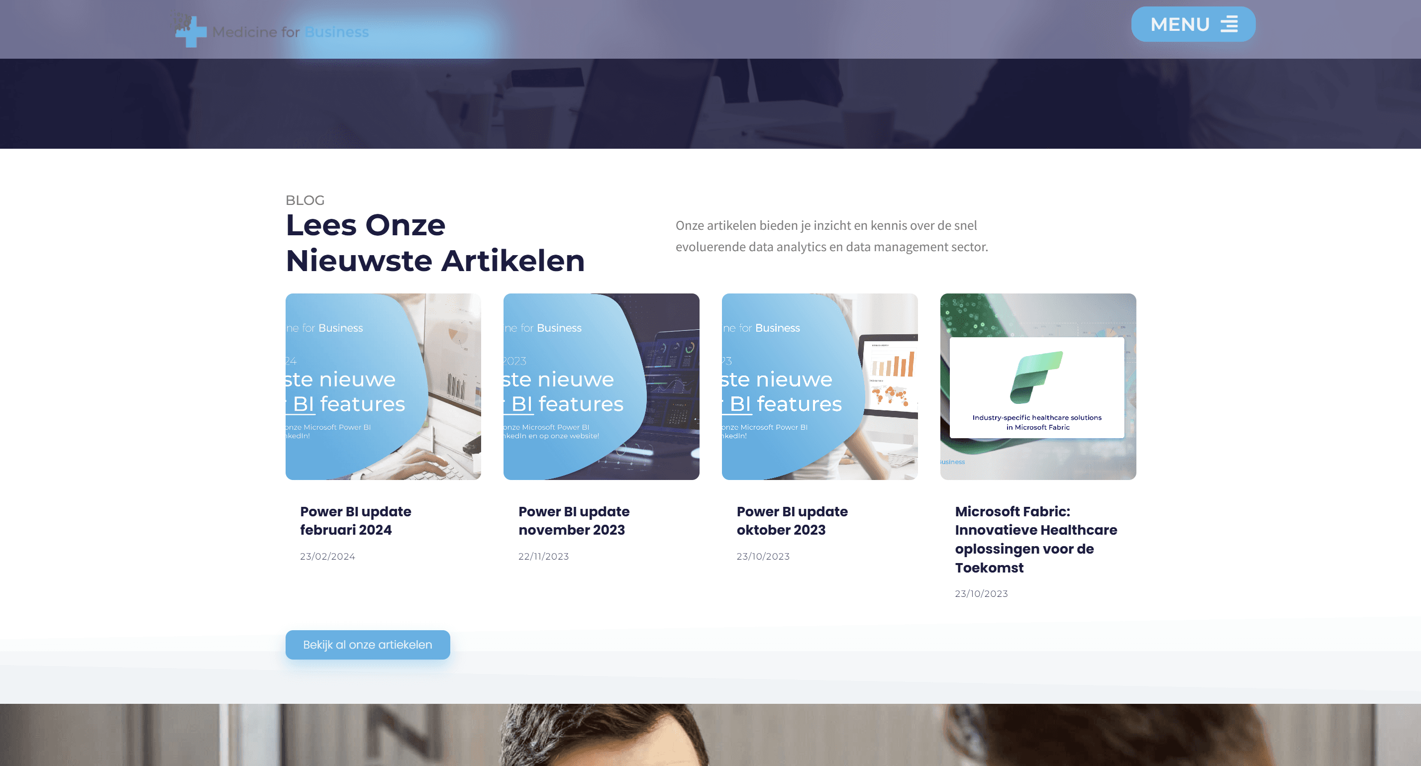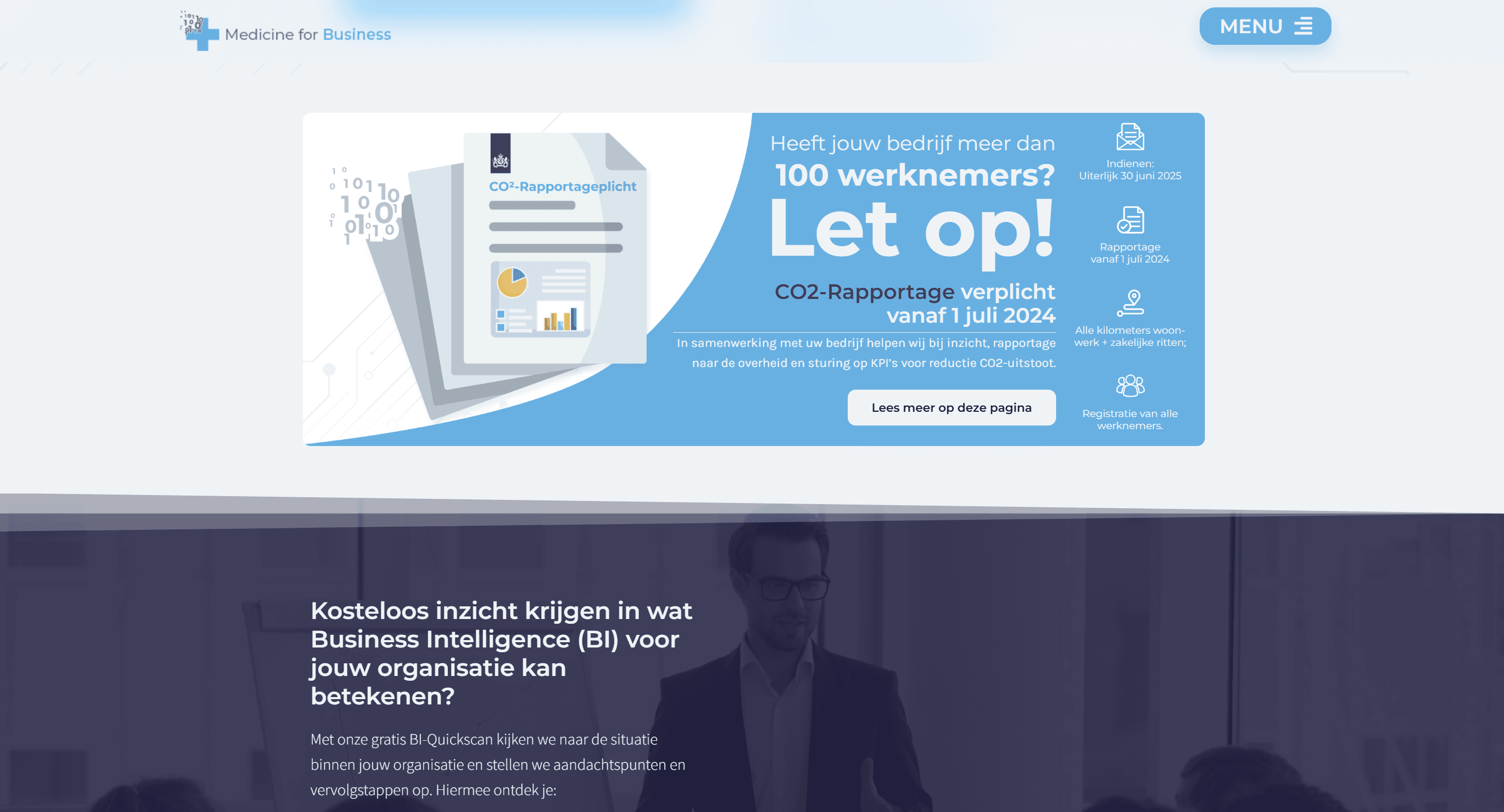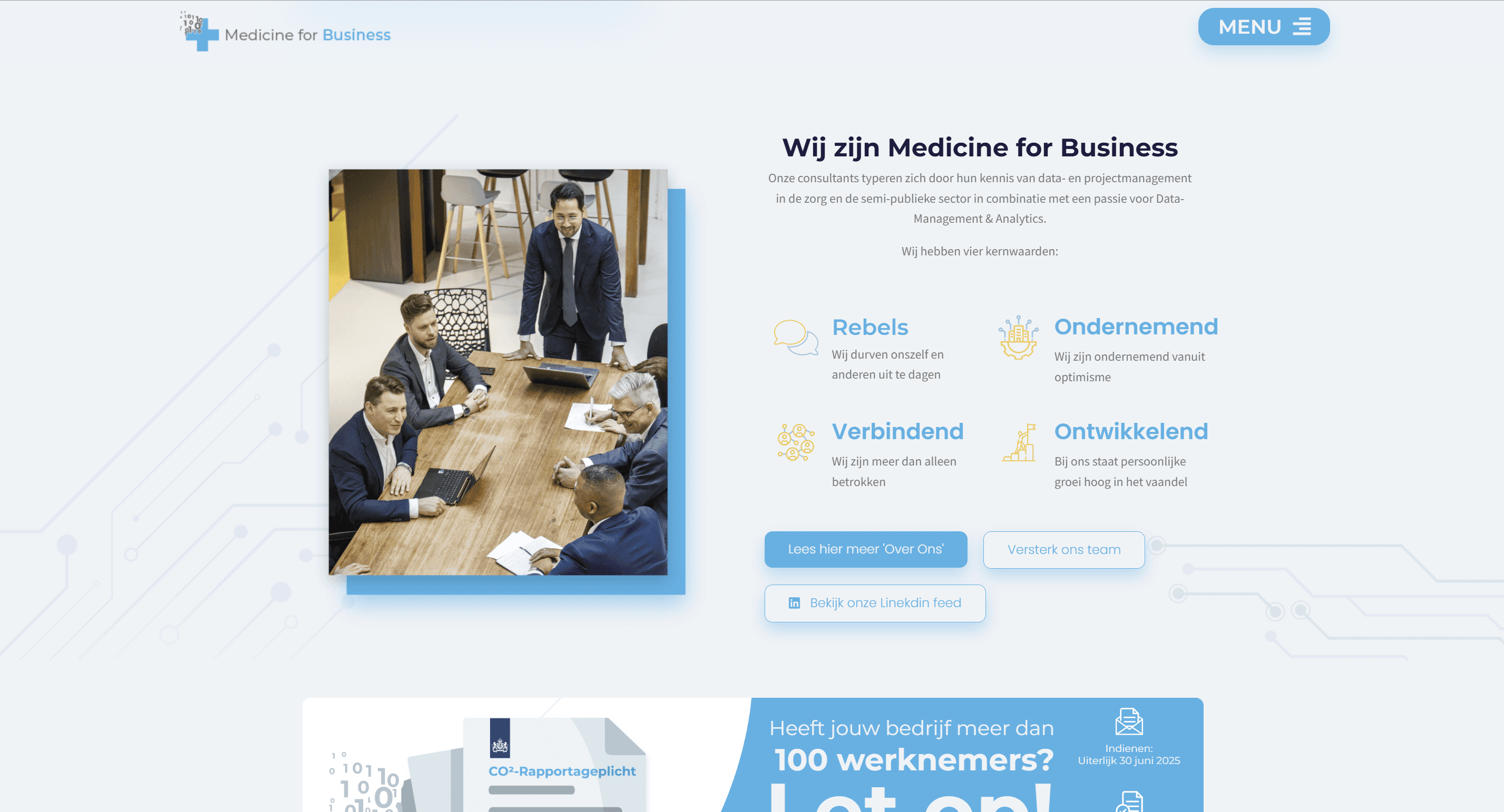 As a Marketing employee, I designed and built the new website of Medicine for Business: medicineforbusiness.nl. The old site was from 2019 and no longer matched the new services, sharpened mission, and vision of the company. Therefore, I realized a completely renewed website within six months in 2024.